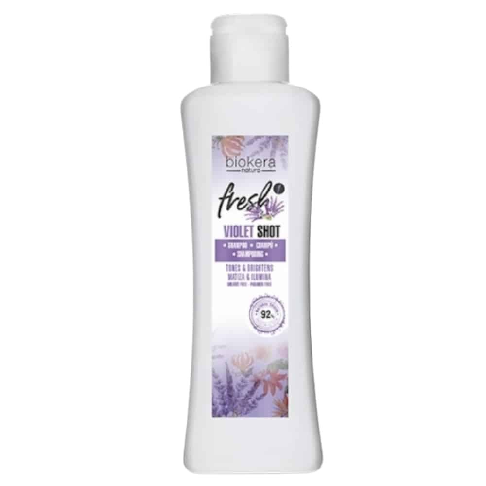 Le SHAMPOING VIOLET SHOT BIOKERA FRESH est formulé pour répondre aux besoins spécifiques des cheveux blonds, gris ou décolorés. Il agit en neutralisant les reflets jaunes et orangés qui peuvent apparaître avec le temps ou après des traitements chimiques. Ce shampoing nettoie délicatement la chevelure, tout en apportant un soin protecteur à la fibre capillaire. Son action combinée permet de raviver l’éclat de la couleur et de maintenir un aspect soigné et lumineux.BénéficesProtection de la couleurRéparation de la fibre capillaireNeutralisation des reflets jaunes et orangésAction anti-âge capillaireApporte du volumeActifs clésLavande : Possède des propriétés antioxydantes et contribue à protéger les cheveux des agressions extérieures.Cassis : Riche en vitamine C, il aide à préserver la couleur des cheveux.Indigo : Contient des pigments naturels qui neutralisent les reflets chauds indésirables.Açaï : Agit comme un revitalisant et antioxydant pour les cheveux.Betterave : Nourrit les cheveux, les renforce et leur donne de l’éclat.Conseils d’utilisationAppliquer le shampoing sur cheveux mouillés.Masser délicatement le cuir chevelu et les longueurs.Laisser poser le produit entre 1 et 5 minutes, selon l’intensité de la neutralisation souhaitée.Rincer abondamment.Répéter l’opération si nécessaire.