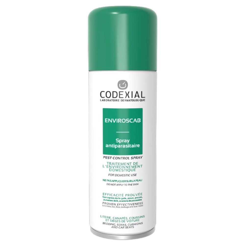 ENVIROSCAB est un dispositif biocide de haute performance spécifiquement élaboré par le Laboratoire Codexial pour le traitement de l’environnement domestique infesté. Ce spray antiparasitaire est un complément indispensable au traitement médical des parasitoses humaines (gale, pédiculose, etc.). Il permet d’éliminer les parasites présents sur les supports textiles qui ne peuvent être lavés à haute température, limitant ainsi drastiquement les risques de recontamination indirecte. BénéficesÉlimination radicale des sarcoptes de la gale et des punaises de litEfficacité prouvée contre les poux, les puces et les acariens de poussièreAction rapide : les textiles traités sont réutilisables après seulement 6 heuresFormat spray pratique sans gaz propulseur pour une application précisePermet de traiter les objets volumineux ou fragiles (matelas, casques, chaussures, sièges auto) Actifs clésPerméthrine (ISO) : Insecticide et acaricide puissant agissant par contact.D-Tétraméthrine : Actif à effet de choc immédiat sur les parasites.Pipéronyl Butoxyde : Synergiste qui démultiplie l’efficacité des agents insecticides.Géraniol : Actif d’origine naturelle complétant l’action antiparasitaire du mélange. Spectre d’actionSarcoptes de la galePunaises de litPoux de tête et de corpsPuces et acariens Conseils d’utilisationNe pas appliquer sur la peau ou les cheveux.Pulvériser à une distance de 30 cm sur les surfaces à traiter (literie, canapés, coussins).Aérer largement la pièce pendant et après la pulvérisation.Laisser sécher complètement. Les articles sont réutilisables 6 heures après le traitement.Pour les textiles lavables, privilégier un lavage en machine à 60°C.Ne pas utiliser en présence d’enfants, d’animaux ou de personnes asthmatiques/allergiques.