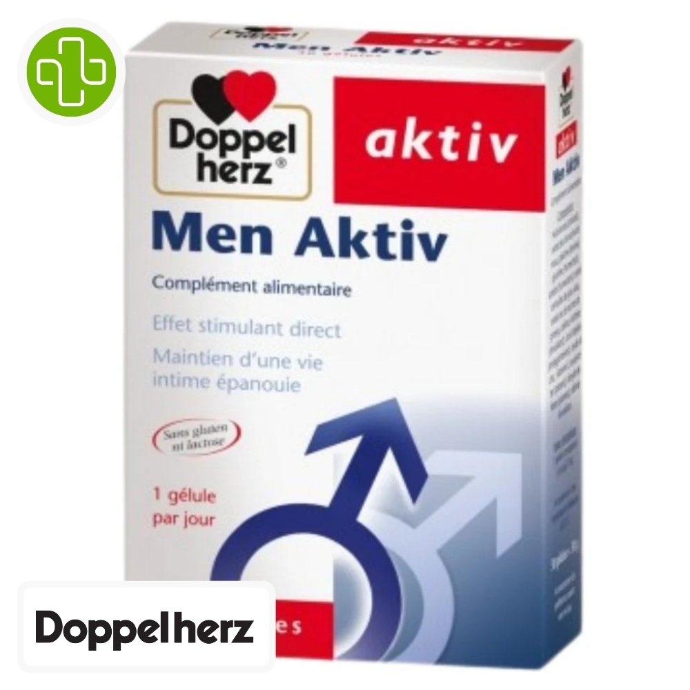Doppelherz Men Aktiv est un complément alimentaire conçu pour les hommes souhaitant améliorer leur bien-être intime. Sa formulation unique associe des extraits de plantes, des vitamines et des minéraux sélectionnés pour leurs effets bénéfiques sur la fonction reproductive masculine. Ce produit est particulièrement adapté aux hommes confrontés à une baisse de libido ou à un dysfonctionnement érectile modéré, offrant une approche naturelle pour soutenir leur vitalité sexuelle et leur santé globale.BénéficesAide à maintenir une vie intime épanouie.Soutient la fertilité et la fonction du système reproducteur.Actifs clésExtrait de racine de Maca (250 mg) : Le Maca influence positivement le psyché et contient des éléments qui favorisent la fonction circulatoire, la transmission nerveuse et la qualité de l’éjaculat.Extrait de Gotu Kola (25 mg) : Améliore la circulation sanguine périphérique, notamment au niveau des organes génitaux.Ginseng (25 mg) : Possède un effet stimulant et énergisant.Caféine (25 mg) : Stimule l’organisme et procure un regain d’énergie.Vitamine E (5 mg) : Antioxydant qui protège les cellules contre le stress oxydatif.Zinc (7.5 mg) : Contribue au maintien d’un taux normal de testostérone.Sélénium (25 µg) : Important pour la formation du sperme.Conseils d’utilisationPrendre 1 gélule par jour au repas avec suffisamment de liquide, sans mâcher.Ne pas dépasser la posologie recommandée.Ce complément alimentaire ne doit pas se substituer à une alimentation équilibrée et variée.Tenir hors de la portée des enfants.A conserver à une température inférieure à 25 °C.