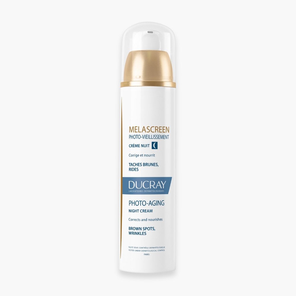 Découvrez DUCRAY – Melascreen Photo-Vieillissement Crème Nuit – 50ml au prix de 315 au Maroc.La MELASCREEN PHOTO-VIEILLISSEMENT Crème nuit est un soin global et régénérant conçu pour traiter les signes visibles du photo-vieillissement (vieillissement accéléré de la peau dû à l’exposition solaire). Ce phénomène se manifeste par une association de taches brunes, de rides et d’une perte de fermeté.Appliquée le soir, cette crème agit pendant la nuit, moment optimal pour la réparation cutanée, afin de réduire visiblement les désordres pigmentaires et les marques de l’âge. Elle aide à réduire les taches brunes localisées, à unifier le teint, et à redensifier la peau pour atténuer les rides.Sa formule riche en actifs dermatologiques de référence apporte une nutrition intense et une action repulpante pour que la peau retrouve son éclat et sa souplesse au réveil. Avec sa texture onctueuse, non collante et d’une très bonne tolérance, elle est l’alliée des peaux normales à sèches et s’utilise seule ou en complément de procédures dermatologiques anti-âge.BénéficesUnifie le teint et contribue à atténuer l’apparence des taches brunes (réduction de -20 % de l’intensité des taches¹).Réduit l’apparence des rides et lisse le grain de peau pour un effet repulpant (80 % de satisfaction sur la redensification²).Nourrit et hydrate la peau en profondeur grâce à sa texture fondante et riche (91 % de satisfaction sur la nutrition²).Raffermit et aide la peau à retrouver sa densité et son éclat.Actifs clésPro-Vitamine C (Ascorbyl Glucoside) : Actif reconnu pour son action puissante anti-taches et antioxydante qui aide à réguler la production de mélanine et à protéger les cellules du stress oxydatif.Niacinamide (Vitamine B3) : Contribue à bloquer le transfert de la mélanine vers la surface de la peau, limitant ainsi l’apparition des taches. Possède également des propriétés apaisantes et aide à renforcer la barrière cutanée.Acide Hyaluronique (faible poids moléculaire) : Hydrate intensément et aide à repulper la peau en profondeur, améliorant ainsi l’apparence des rides et la fermeté.Glycérine & Squalane : Agents hydratants et nourrissants qui renforcent la barrière lipidique de la peau.RésultatsAtténuation des taches : -20 % d’intensité des taches brunes¹.Redensification de la peau : 80 % de satisfaction².Peau nourrie : 91 % de satisfaction².Conseil d’utilisationAppliquer la crème le soir (quotidiennement) sur le visage et le décolleté.Pour une routine complète, utiliser en association avec un soin antitaches de jour protecteur (SPF50+) de la gamme MELASCREEN.Précautions : Éviter le contact avec les yeux.¹Étude clinique et instrumentale sur 46 femmes après 28 jours d’application le soir. Mesures instrumentales (diminution significative de l’intensité des taches brunes de 20 % à l’angle ITA).²Agrément perçu par les sujets après 28 jours d’application. 46 sujets, % de satisfaction.