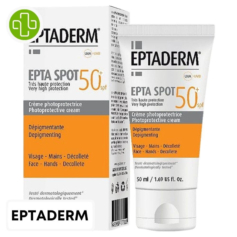 Découvrez EPTADERM – Epta Spot Crème PHOTOPROTECTRICE Dépigmentante SPF50+ – 50ml au prix de 170 au Maroc.La Crème Solaire Dépigmentante EPTA SPOT SPF 50+ – 50ml est une crème photoprotectrice conçue pour la protection solaire des peaux présentant des décolorations. Cette crème offre une très haute protection contre les rayons UVA et UVB tout en contrôlant et prévenant la décoloration de la peau. La texture légère de l’EPTA SPOT SPF 50+ procure une hydratation et une brillance agréables, ce qui en fait un choix idéal pour une utilisation quotidienne. Cette crème est conçue pour être appliquée sur le visage, le décolleté et les mains, et elle peut également servir de base pour le maquillage. Elle est formulée sans parfum ni parabens, a été testée dermatologiquement et n’a pas été testée sur les animaux. Bon à savoir :Eau des glaciers suisses : Offre un effet apaisant sur la peau.Tinosorb S : Assure une haute protection solaire contre les rayons UVA/UVB, tout en offrant une excellente stabilité et une résistance à l’eau.Gigawhite® : Possède des propriétés dépigmentantes et antioxydantes.Via pure® : Inhibe la tyrosinase, éclaircit la peau, offre des propriétés antioxydantes et dépigmentantes.Extrait d’écorce de magnolia : Offre un effet antioxydant.Vitamine E : Possède des propriétés antioxydantes.Conseils d’application :Appliquez soigneusement et uniformément la crème Photoprotectrice EPTA SPOT SPF 50+ sur tous les endroits présentant une décoloration (visage, décolleté, mains) avant chaque exposition au soleil.Réappliquez la préparation toutes les quelques heures et après chaque bain ou effort physique.