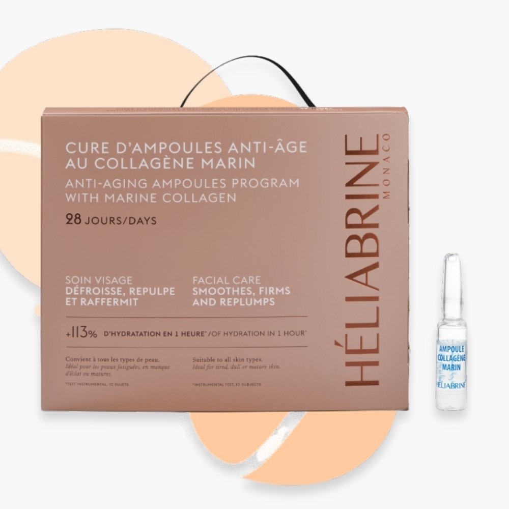 Cure anti-âge intensive Heliabrine® pour peaux matures et dévitalisées. Hautement concentrées en Collagène Marin soluble et Peptides anti-âge, ces ampoules stimulent la production de collagène, repulpent et raffermissent la peau. Effet jeunesse remarquable dès 6 jours.