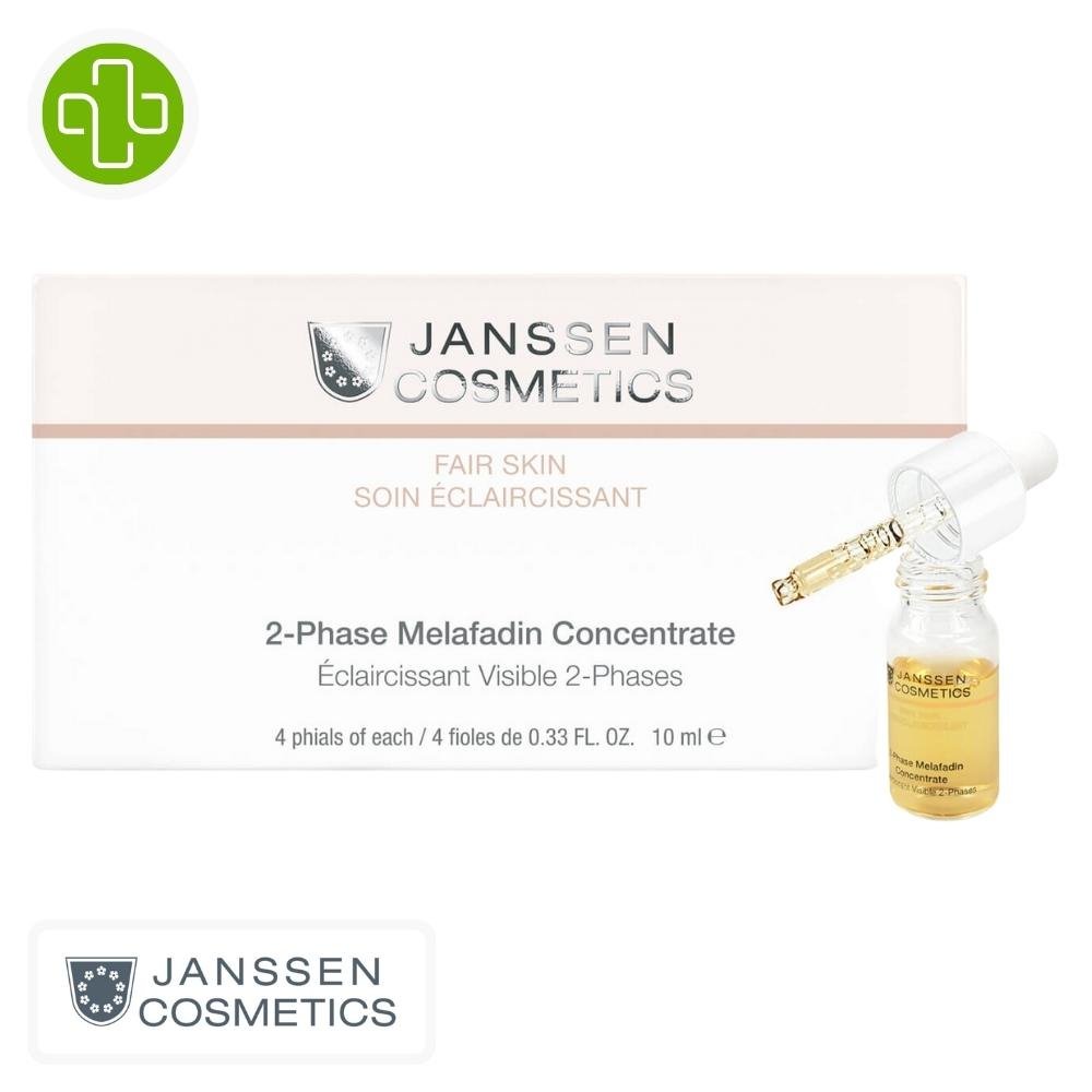 Le concentré 2-Phase Melafadin est le traitement le plus puissant de Janssen Cosmetics pour corriger les hyperpigmentations sévères. Présenté sous forme de flacons bi-phasés pour garantir une fraîcheur et une efficacité maximale des actifs, ce soin inhibe l’enzyme tyrosinase responsable de la production de mélanine. En combinant de la Vitamine C pure (poudre) et un complexe éclaircissant (liquide) au moment de l’utilisation, il pénètre en profondeur pour décomposer les amas pigmentaires existants et prévenir l’apparition de nouvelles taches. Idéal pour traiter le mélasma, les taches de vieillesse ou les marques de soleil, il transforme radicalement la clarté de la peau. Sa formule hydratante assure également une peau souple et revitalisée tout au long de la cure de 6 semaines.BénéficesRéduction visible et rapide des taches pigmentaires et des décolorations.Éclaircissement global du teint pour un effet porcelaine.Inhibe la production excessive de mélanine à la racine.Puissante action antioxydante grâce à la vitamine C pure.Améliore l’éclat naturel et la transparence de la peau.Cure intensive de 6 semaines pour des résultats durables.Actifs clésVitamine C Pure (Phosphate d’Ascorbyle de Sodium) : Éclaircit la peau, stimule le collagène et neutralise les radicaux libres.Acide Ellagique (extrait d’écorce de bouleau) : Un actif éclaircissant naturel qui réduit la synthèse de mélanine.Acide Hyaluronique : Maintient une hydratation optimale durant le processus d’éclaircissement.Extraits de plantes éclaircissants : Synergie d’actifs végétaux pour unifier le grain de peau.RésultatsDiminution significative de l’intensité des taches brunes après une cure complète.Teint visiblement plus homogène, lumineux et éclatant.Grain de peau affiné et apparence plus jeune.Conseils d’utilisationCure de 6 semaines : 1 flacon dure environ 10 à 12 jours.Activation : Appuyer fermement sur le bouchon rouge pour libérer la poudre de Vitamine C dans le liquide. Agiter vigoureusement.Remplacer le bouchon par la pipette fournie.Appliquer environ 1 ml de concentré chaque soir sur le visage et le cou parfaitement nettoyés.Précautions : Utiliser impérativement une protection solaire haute (SPF 50) la journée.Conserver le flacon activé à l’abri de la lumière et de la chaleur (idéalement au frais).