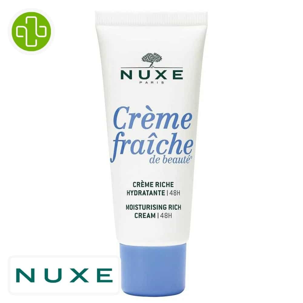 La Crème Riche Hydratante 48h de la gamme Crème Fraîche de Beauté de NUXE est un soin conçu pour les peaux sèches nécessitant une hydratation intense et durable. Cette crème contribue à apaiser immédiatement les sensations d’inconfort et de tiraillements souvent associées à la sécheresse cutanée. Sa formulation respecte l’équilibre du microbiome cutané, favorisant ainsi une peau saine et pleine de vitalité. L’application régulière de cette crème aide à révéler un teint plus lumineux et éclatant, tout en procurant une sensation de fraîcheur et de bien-être. Elle nourrit la peau sans laisser de film gras.BénéficesHydratation continue pendant 48h.Nourrit intensément la peau sèche.Apaise les sensations d’inconfort et de tiraillements.Illumine le teint et apporte de l’éclat.Respecte le microbiome cutané.Actifs clésLait Végétal et Huile d’Amande Douce : Cette association contribue à hydrater la peau de manière immédiate et durable.Extrait d’Algue Rouge « Hyaluronic-Like » : Cet actif booste l’hydratation dans le temps, avec une efficacité prouvée jusqu’à 48 heures. Son action hydratante est similaire à celle de l’acide hyaluronique.Beurres de Karité Bio et de Moringa : Ces beurres végétaux fondent progressivement au contact de la peau, la nourrissant intensément sans laisser de film gras.Résultats100% des femmes constatent une peau plus belle, nourrie et réconfortée immédiatement après l’application.100% des femmes sont convaincues du pouvoir hydratant de la crème dès l’application.Conseils d’utilisationPrélever une quantité généreuse de crème.La chauffer entre les mains.Appliquer sur le visage, le cou et le décolleté en évitant le contour des yeux.Masser jusqu’à pénétration complète.Le matin, effectuer de légers tapotements pour réveiller l’éclat du teint.Le soir, appliquer en douceur sur les joues, le front, le menton et le centre du visage.Appliquer idéalement après le sérum, matin et/ou soir.
