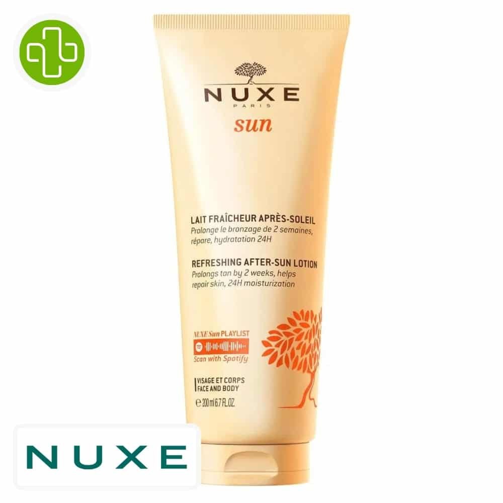 Le Lait Fraicheur Après-Soleil visage et corps 200 ml de NUXE, dans sa formule originale, est spécialement conçu pour les peaux ayant subi une exposition solaire. Ce soin a pour objectif d’apaiser, de réparer et d’hydrater la peau en profondeur, tout en prolongeant la durée du bronzage. Sa texture légère et fondante permet une application facile et une absorption rapide, sans laisser de film gras ou collant. Il procure une sensation de fraîcheur immédiate et enveloppe la peau d’un parfum solaire, invitant à la détente et à la prolongation des vacances.BénéficesApaise la peau après l’exposition au soleil.Répare et hydrate durablement.Sublime et prolonge le bronzage de 2 semaines.Texture fondante non grasse et non collante.Parfum d’évasion aux notes d’Orange douce, de Fleur de Tiaré et de Vanille.Actifs clésExtrait de poudre de caroube: Cet actif est reconnu pour sublimer naturellement le bronzage, contribuant à prolonger son éclat et son intensité.Huile de tournesol: Riche en acides gras essentiels, elle contribue à nourrir et à réparer la peau après l’exposition solaire.Huile de coco hydrogénée: Elle apporte hydratation et douceur à la peau, tout en laissant un parfum délicat.Huile de jojoba: Similaire au sébum humain, elle nourrit et protège la peau sans obstruer les pores.Extrait de Fagraea Berteroana: Un extrait de fleur qui contribue à apaiser la peau.Extrait d’Eichhornia Crassipes: Contribue à l’hydratation de la peau.RésultatsPeau immédiatement réconfortée pour 90% des utilisatrices.Peau hydratée pour 93% des utilisatrices.Peau apaisée pour 98% des utilisatrices.Conseils d’utilisationAppliquer généreusement sur le visage et le corps après chaque exposition au soleil.Peut être utilisé toute l’année pour hydrater et parfumer la peau.