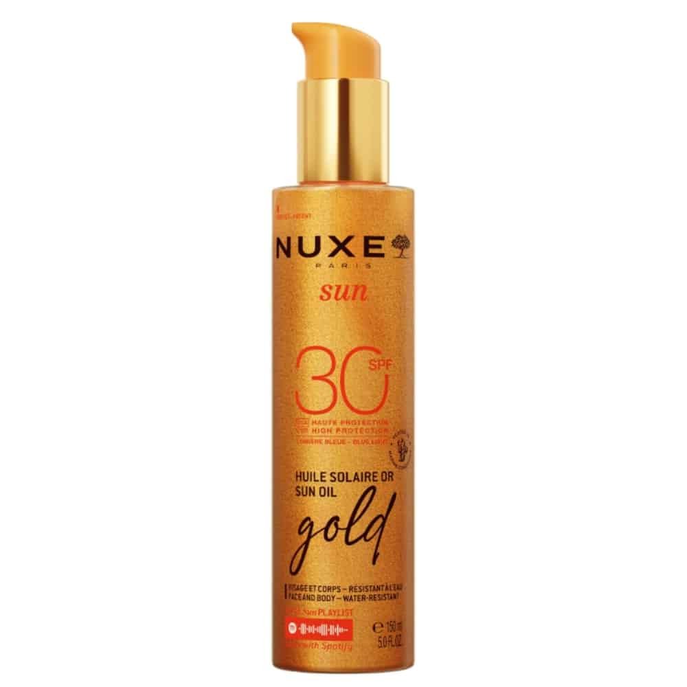 L’Huile Solaire Or Haute Protection SPF30 de NUXE SUN offre une protection solaire à large spectre contre les UVA/UVB et la lumière bleue. Sa formule résistante à l’eau et non-comédogène convient à tous les types de peau. Elle hydrate, illumine et sublime la peau d’un éclat doré grâce à ses nacres d’origine naturelle.