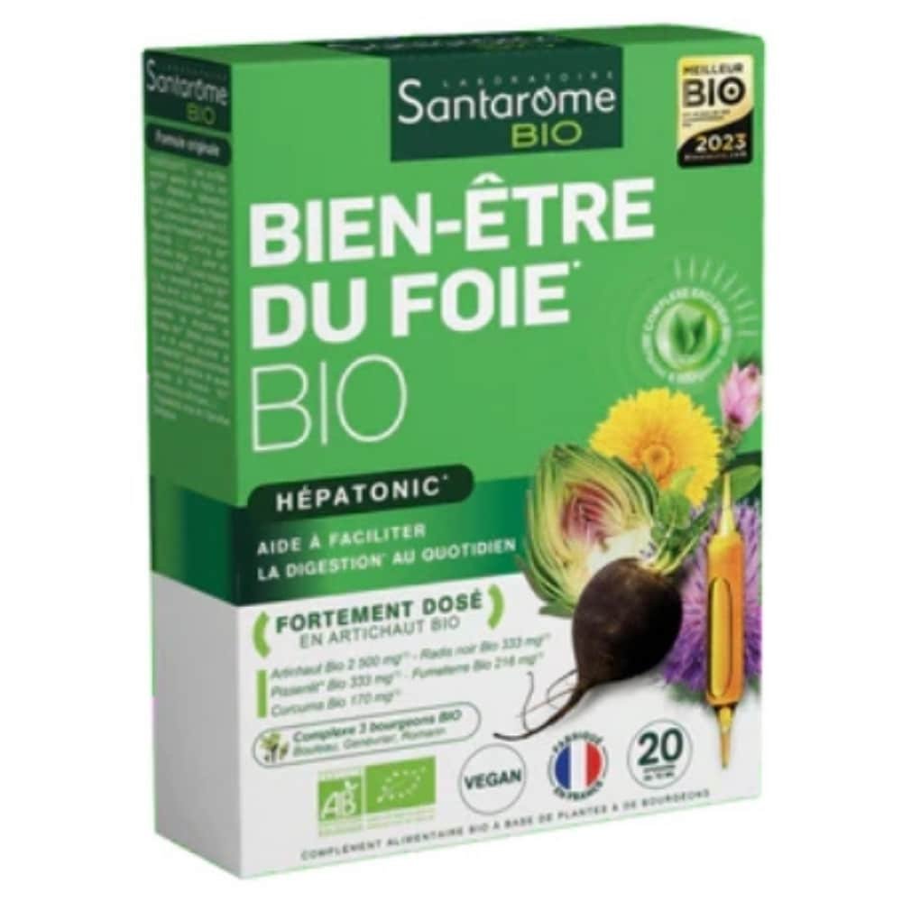 Le complément alimentaire Bien-Être du Foie Bio de Santarome, primé « Meilleur Produit Bio » en 2023, est une formule historique de 30 ans d’expertise dédiée à la détoxification hépatique. Il est idéal pour soutenir l’organisme après des repas copieux ou lors des changements de saison, contribuant à revitaliser le système digestif et à restaurer l’énergie.BénéficesContribue au fonctionnement normal du foie.Favorise le confort digestif.Aide à la détoxification de l’organisme.Soutient la digestion des graisses.Soutient la fonction biliaire.Actifs clésPissenlit Bio : Reconnu pour son rôle dans le fonctionnement hépatique et le confort digestif.Artichaut Bio : Dosé à 2500 mg* en équivalent plante sèche, il est considéré comme une plante essentielle pour le foie.Radis Noir Bio : Une plante historique, potentiellement la première espèce de radis cultivée.Fumeterre Bio : Contribue au maintien d’un foie sain.Curcuma Bio : Soutient le foie et la fonction biliaire.Trio de bourgeons Bio (Romarin, Bouleau, Genévrier) : Ces bourgeons, récoltés à la main, frais, bio et sauvages, sont de véritables élixirs concentrant l’ensemble des actifs de la plante (totum). Ils sont préparés selon la méthode du Dr Pol Henry, par macération pendant 21 jours dans un mélange d’eau, d’alcool et de glycérine.*Équivalent plante sècheRésultatsAide à réduire les ballonnements et facilite la digestion.Contribue à une sensation de légèreté et de bien-être général.Soutient la revitalisation de l’organisme, notamment après des excès alimentaires.Favorise une meilleure énergie en aidant le foie à fonctionner de manière optimale.Conseils d’utilisationPrendre 1 ampoule par jour.Diluer l’ampoule dans un grand verre d’eau (20 cl).Consommer avant le repas.Durée du programme : 20 jours.Peut être renouvelé si nécessaire, sans dépasser 6 semaines d’utilisation prolongée.Pour ouvrir l’ampoule : agiter, casser une pointe avec un mouchoir, verser le contenu, puis casser la deuxième pointe pour faciliter l’écoulement.Idéal après un repas copieux, une période d’excès ou pour une détox saisonnière.Précautions d’emploiAgiter l’ampoule avant chaque utilisation.Un léger dépôt peut apparaître en raison des extraits de plantes Bio, cela n’altère en rien la qualité du produit.Conserver le produit à l’abri de la lumière et à une température inférieure à 25°C.Ce complément alimentaire doit être utilisé dans le cadre d’une alimentation variée et équilibrée et d’un mode de vie sain.Ne pas dépasser la dose journalière recommandée.Tenir hors de portée des jeunes enfants.Déconseillé aux enfants de moins de 12 ans.Déconseillé aux femmes enceintes ou allaitantes.Déconseillé aux personnes sous traitement anticoagulant.Déconseillé aux personnes souffrant d’allergie aux dérivés salicylés.Déconseillé aux personnes atteintes de maladies des voies biliaires.Ne pas utiliser en cas d’insuffisance rénale.Les personnes sous traitement médicamenteux, ainsi que celles souffrant d’hypothyroïdie ou sous traitement de la thyroïde, doivent consulter un professionnel de santé avant utilisation.Ne pas utiliser de manière prolongée au-delà de 6 semaines.