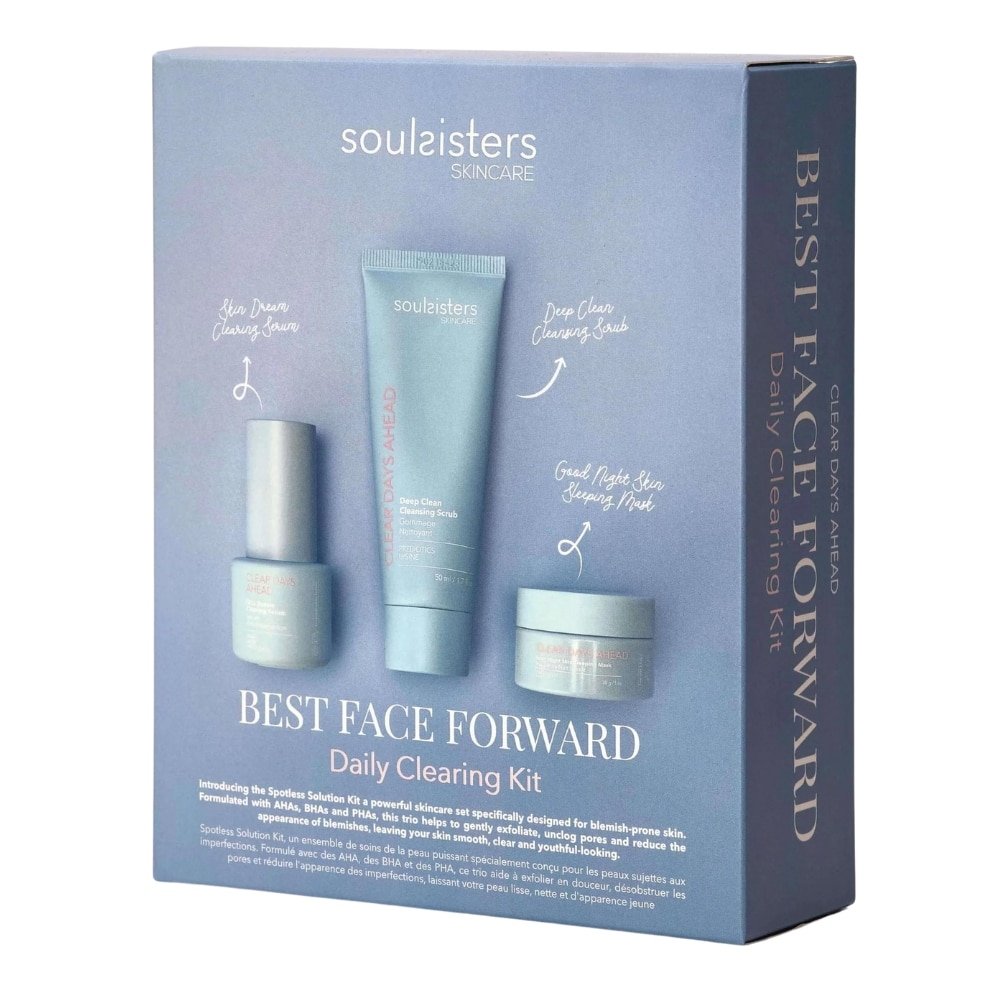 Découvrez SOULSISTERS – Clear Days Ahead Best Face Forward Kit Anti-imperfections Quotidien – 1u au prix de 380 au Maroc.Découvrez notre ensemble Best Face Forward, conçu pour révéler la meilleure version de votre peau. Cet ensemble comprend un Gommage Nettoyant Anti-Imperfections de 50ml, un Sérum Anti-Imperfection de 15ml, et un Masque de Nuit Lissant de 30g. Chacun de ces produits a été minutieusement formulé pour cibler les imperfections et promouvoir une peau éclatante et saine.Conseils d’Application:Masque de Nuit Lissant: Appliquez généreusement une couche uniforme du masque de nuit lissant sur votre visage en tant que dernière étape de votre routine de nuit. Tamponnez doucement le masque sur la peau et rincez-le le matin pour révéler une peau visiblement plus lisse et revitalisée.Gommage Nettoyant Anti-Imperfection: Appliquez une petite quantité du gommage visage nettoyant sur une peau humidifiée. Massez délicatement en mouvements circulaires pour exfolier en douceur, puis rincez abondamment. Ce gommage aide à éliminer les impuretés et à affiner la texture de la peau.Sérum Anti-Imperfection: Pour une application efficace, délivrez une à deux pompes de sérum acide salicylique sur une peau propre et sèche. Tapotez doucement jusqu’à absorption complète. Utilisez le sérum tous les soirs pour cibler les imperfections, et n’oubliez pas d’appliquer un écran solaire le matin pour protéger votre peau des rayons nocifs du soleil.En suivant ces conseils simples mais efficaces, vous êtes sur la voie d’une peau d’apparence saine et radieuse. Adoptez la routine Best Face Forward pour révéler votre beauté naturelle.
