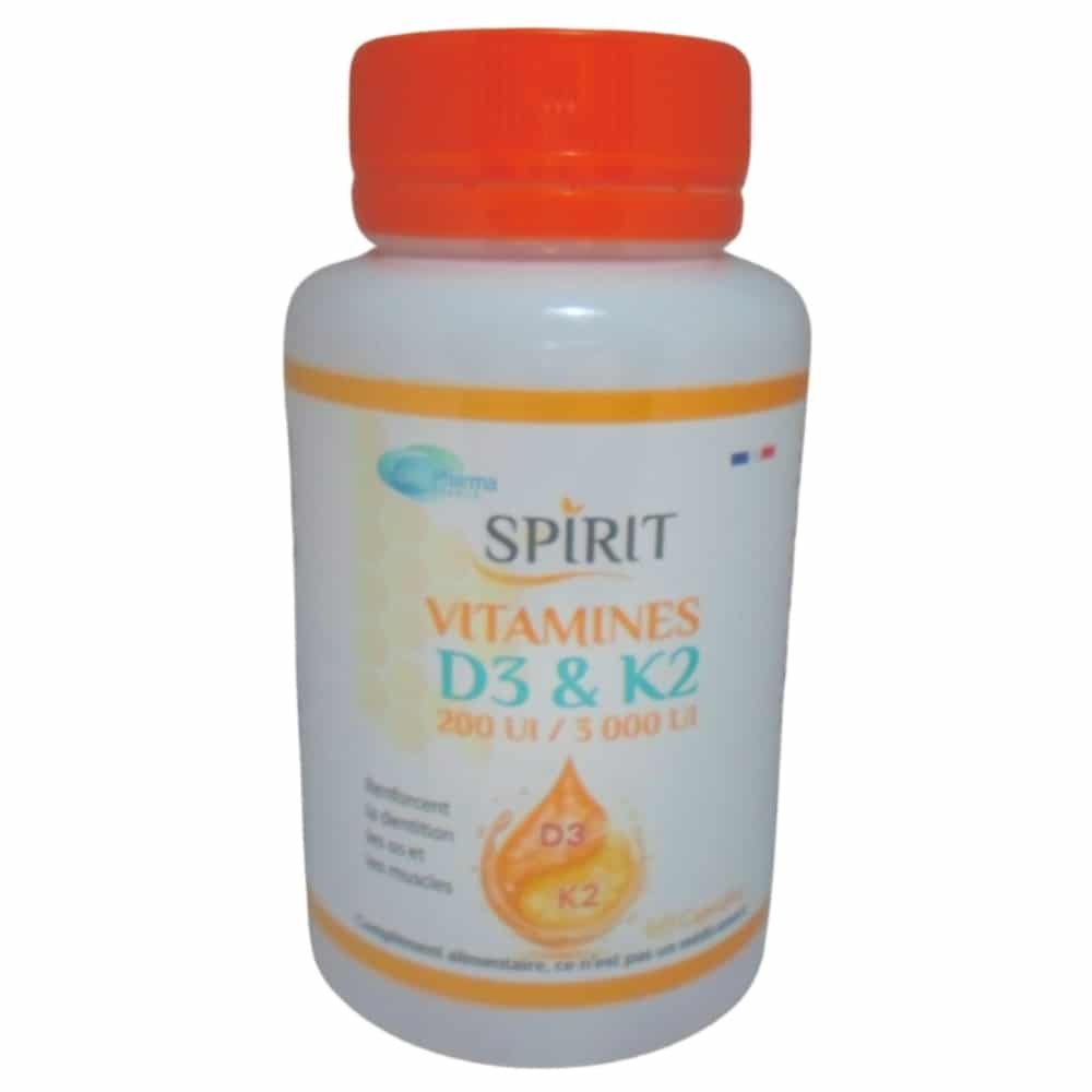 Spirit Vitamines D3 & K2 est un complément alimentaire conçu pour apporter un soutien aux fonctions osseuses et vasculaires. Sa formulation repose sur l’association de vitamine D3 et de vitamine K2, deux éléments nutritifs essentiels qui agissent en synergie. La vitamine D3 joue un rôle crucial dans l’absorption du calcium et du phosphore, tandis que la vitamine K2 contribue à la coagulation sanguine et au maintien d’une ossature normale. Ce complément est destiné aux adultes et doit être utilisé dans le cadre d’une alimentation variée et équilibrée et d’un mode de vie sain.BénéficesContribue au maintien d’une ossature normale grâce à la vitamine D3.Contribue au maintien d’une ossature normale et d’une coagulation sanguine normale grâce à la vitamine K2.Favorise une bonne absorption et utilisation du calcium et du phosphore.Renforce la dentition, les os et les muscles.Participe à la bonne santé du système vasculaire.Prévient les calcifications artérielles.Actifs clésVitamine D3 (cholécalciférol) : Contribue à l’absorption du calcium et du phosphore, favorisant ainsi la santé des os et des dents. Elle joue également un rôle dans le fonctionnement du système immunitaire.Vitamine K2 (ménaquinone) : Essentielle pour la coagulation sanguine normale et le maintien d’une ossature saine. Elle active une protéine qui empêche les dépôts de calcium dans les artères, contribuant ainsi à la prévention des calcifications artérielles.Conseils d’utilisationPrendre 1 à 2 gélules par jour pendant les repas.Ne pas dépasser la dose journalière recommandée.Ne se substitue pas à une alimentation variée et équilibrée et à un mode de vie sain.Déconseillé aux enfants, aux adolescents, aux femmes enceintes ou allaitantes.Tenir hors de portée des jeunes enfants.