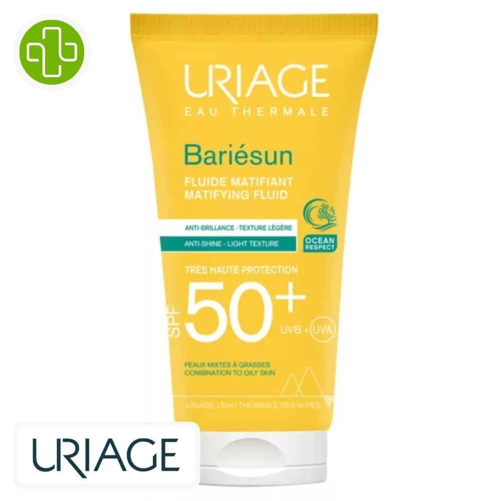 Le fluide matifiant SPF50+ de la gamme Bariésun est un soin solaire spécialement formulé pour répondre aux besoins des peaux mixtes à grasses. Il combine un complexe filtrant performant et l’Eau Thermale d’Uriage pour assurer une protection solaire élevée contre les UVA et UVB. Sa texture légère contribue à un effet anti-brillance, une absorption rapide et une hydratation continue, tout en prévenant les dommages cellulaires induits par l’exposition solaire.BénéficesProtège la peau contre les UVA et UVB grâce à son complexe de filtres.Optimise la photoprotection et aide à limiter la pénétration des filtres UV.Matifie durablement la peau grâce à l’extrait de Licorice.Prévient le dessèchement cutané grâce à l’Eau Thermale d’Uriage et aux Aquaspongines.Actifs clésComplexe filtrant anti UVA-UVB: Assure une protection solaire à large spectre contre les rayonnements UVA et UVB, prévenant ainsi les dommages cutanés liés à l’exposition solaire.Brevet Bariésun: Forme un film protecteur à la surface de la peau, limitant la pénétration des filtres UV et optimisant la photoprotection.Brevet Licorice: Contribue à un effet matifiant durable grâce à son action sébo-régulatrice, réduisant ainsi la brillance de la peau.Glycérine: Agent hydratant qui aide à maintenir l’hydratation de la peau.Poudre absorbante: Contribue à l’effet matifiant en absorbant l’excès de sébum.Aquaspongines: Aident à prévenir le dessèchement cutané en retenant l’eau dans l’épiderme.Résultats100% adapté aux problématiques des peaux mixtes à grasses.Conseils d’utilisationAppliquer une dose suffisante de produit avant l’exposition, par exemple l’équivalent d’une cuillère à café pour le visage et le cou.Renouveler fréquemment l’application, surtout après avoir transpiré, nagé ou s’être essuyé.Même bien protégé, réduire au maximum l’exposition.Ne pas exposer les bébés et les jeunes enfants directement au soleil.