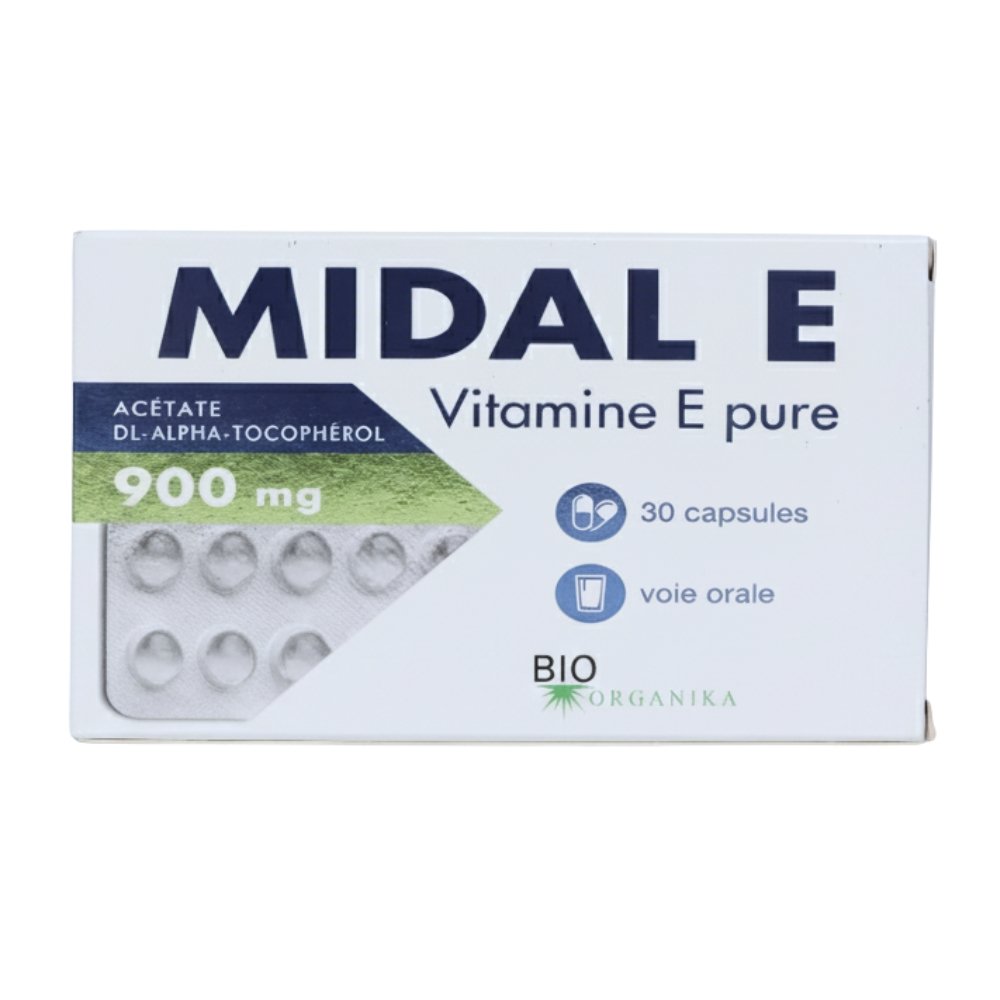 VEERA SANTÉ MIDAL E VITAMINE E PURE 30 capsules est un complément alimentaire qui fournit un apport en vitamine E. Ce micronutriment essentiel intervient dans diverses fonctions biologiques. La vitamine E est notamment reconnue pour son rôle d’antioxydant, contribuant à la protection des cellules contre le stress oxydatif. Elle possède également des propriétés anticoagulantes et soutient le système immunitaire. Son implication dans la santé des cheveux et de la peau en fait un actif d’intérêt dans le domaine de la dermocosmétique.BénéficesContribue à l’apport de vitamine E.Participe au maintien de la santé des cheveux.Soutient la santé de la peau.Actifs clésVitamine E : Antioxydant qui aide à protéger les cellules contre les dommages causés par les radicaux libres. Elle contribue également à la santé de la peau et des cheveux.Conseils d’utilisationPrendre une capsule par jour.Avaler la capsule avec un verre d’eau.