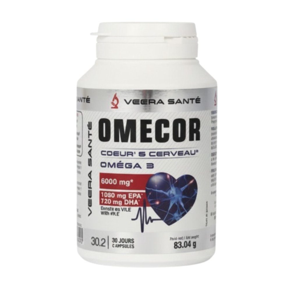 VEERA SANTÉ OMECOR 3 est un complément alimentaire conçu pour soutenir la santé cardiovasculaire et les fonctions cérébrales. Présenté en pilulier de 60 capsules, ce produit fournit un apport concentré en acides gras oméga-3, notamment l’acide eicosapentaénoique (EPA) et l’acide docosahexaénoique (DHA). Ces composants sont essentiels pour le maintien d’une fonction cardiaque normale et contribuent au bon fonctionnement du cerveau, offrant ainsi un soutien nutritionnel ciblé pour le bien-être général.BénéficesContribue à la protection du cœur.Favorise l’équilibre émotionnel.Hautement dosé en EPA et DHA.Soutient le bon fonctionnement du cerveau.Actifs clésHuile de poisson: Source d’acides gras oméga-3, incluant l’EPA et le DHA, essentiels pour la santé cardiovasculaire et cérébrale. L’EPA et le DHA contribuent à une fonction cardiaque normale et au fonctionnement normal du cerveau.Vitamine E: Antioxydant qui aide à protéger les cellules contre le stress oxydatif.Conseils d’utilisationPrendre 2 à 3 capsules par jour, de préférence le matin.Il est conseillé de suivre une cure de 30 jours.Ne pas dépasser la dose journalière recommandée.Conserver dans un endroit sec, à l’abri de la lumière et de la chaleur.