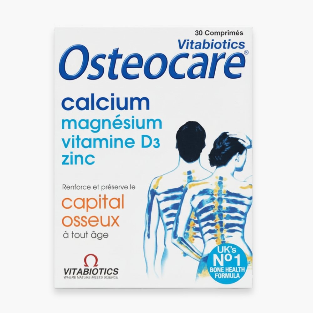 Découvrez VITABIOTICS – Osteocare Original Os Calcium, Magnésium, Vitamine D & Zinc – 30 Comprimés au prix de 92 au Maroc.Osteocare Original est un complément alimentaire sous forme de comprimés, reconnu comme la formule de calcium n°1 au Royaume-Uni. Développé sur la base des recherches les plus récentes, il offre une source riche et équilibrée de calcium et de nutriments de soutien pour le maintien d’une ossature normale tout au long de la vie. La formule unique est conçue pour compléter l’apport alimentaire en calcium et co-facteurs essentiels, jouant un rôle crucial du pic de masse osseuse atteint dans la jeunesse jusqu’à l’entretien post-ménopausique.BénéficesContribution au maintien d’une ossature normale grâce à l’apport de calcium, magnésium, zinc et vitamine D.La vitamine D3, forme privilégiée de vitamine D par l’organisme, soutient l’absorption et l’utilisation normales du calcium.Le calcium et la vitamine D sont essentiels au maintien d’une dentition normale.Le magnésium contribue au fonctionnement normal des muscles et du système nerveux.Fournit un apport équilibré de 100 % de l’apport de référence (AR) en calcium et autres minéraux essentiels.Actifs clésCalcium : Fourni sous forme de carbonate de calcium, essentiel à la structure osseuse et dentaire.Vitamine D3 : Formule optimisée (25 µg ou 1000 UI dans les formules récentes) pour une efficacité maximale dans l’absorption du calcium.Magnésium : Dosé en équilibre avec le calcium pour un soutien osseux et musculaire optimal.Zinc : Oligo-élément soutenant la densité osseuse.RésultatsAide à combler les carences alimentaires potentielles en calcium, magnésium, zinc et vitamine D.Soutien nutritionnel général pour les hommes et les femmes de tous âges, y compris durant la grossesse et l’allaitement (selon les recommandations d’usage).Formulation soutenue par plus de 30 ans de recherche.Alternative en comprimés pratique pour le soutien osseux.Conseil d’utilisationPrendre deux comprimés par jour [citation non disponible dans les snippets, mais dosage standard pour la gamme Osteocare Original].À avaler avec de l’eau ou une boisson froide, de préférence au cours du repas principal [citation non disponible dans les snippets, mais pratique courante pour les Compléments minéraux/vitaminiques].Ne pas mâcher le comprimé [citation non disponible dans les snippets].Ne pas dépasser la dose journalière recommandée [citation non disponible dans les snippets].